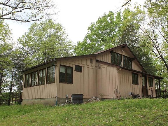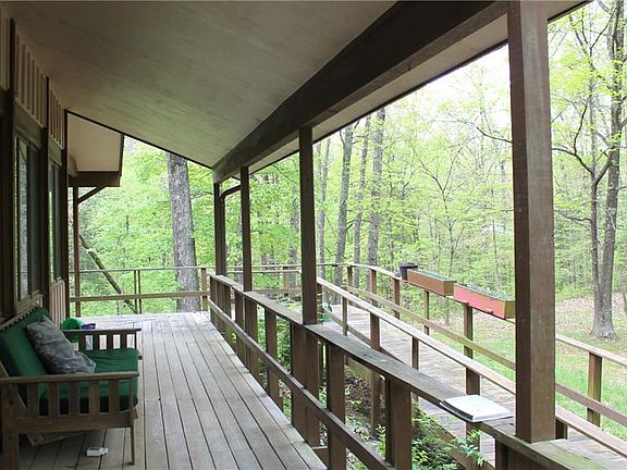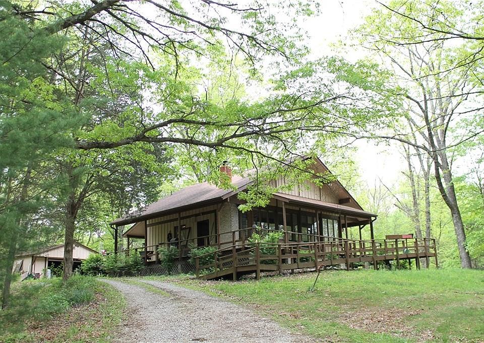 "Walden West" Beautiful Brown County woods surround home. This is a great spot ready for your personal touch as a full time home or your weekend retreat. Lots of wraparound decking (includes a ramp) overlooks small, private pond. Large great room with cathedral ceiling, brick hearth with wood stove, lots of windows here as well as in the master bedroom. One full bath, laundry room and mud room. Nice upstairs loft is 20' x 16' with plenty of under eave storage. 26' x 22' detached garage has room for work space. Rustic chicken coop behind the barn. 15.3 acres designated as Classified Forest.