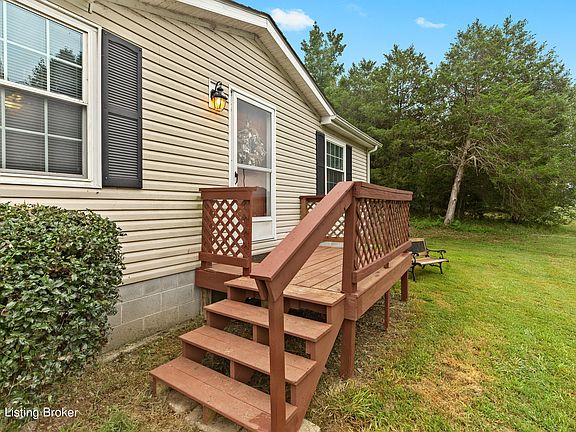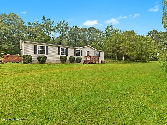 Quiet, country living at its best! ***Approx 8 ACRES, NEW central AC/HEAT - 2024, newer ROOF - 2022, freshly painted large deck, fireplace, chicken coop area, gun range/shooting target area, & an expansive flat front yard*** We welcome you to this well maintained, super spacious modular home that is on a permanent foundation. Inside you'll find 3BR, 2 full baths, a huge living room w/dining area flanked by a warm wood burning fireplace for those chilly evenings. The spacious eat-in kitchen has some newer appliances, & the primary bedroom ensuite has a whirlpool tub & separate shower, along with a large walk-in closet. Outside is a huge deck, detached 2 car carport, & 1 car garage/storage outbuilding across from the chicken coop area. Like to shoot? Walk towards the back of the land to find a custom made shooting/target area. The BG Pkwy & I-65 are very close, so you are within minutes of easy access to Bardstown, Elizabethtown, & Louisville. With all this property has to offer, this one will sell fast, so call for more details or to schedule your showing today!