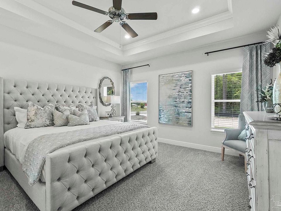 The Destin plan is a beautifully designed 4 bed, 3 bath home with a covered patio and a 3-car garage. This home features a large breakfast nook and separate dining area with a very comfortable open design for easy entertaining. Interior features include stunning granite counter tops in the kitchen and baths, stainless steel appliances, a large island bar and corner pantry. Bedroom 1 is spacious with a walk in closet and adjoining bath that has a double vanity, garden tub and a large separate shower. Beautiful EVP flooring is throughout the home with frieze carpet in the bedrooms. This home comes standard with a Smart Home Technology package which includes a KwikSet keyless entry, Skybell doorbell, automated front porch lighting, an Echo Dot device and a Quolsys touch panel that can control your lighting, thermostat, front door and so much more. A five-minute ride to Interstate I10 puts you minutes from shopping, restaurants, entertainment and Pensacola Beach.