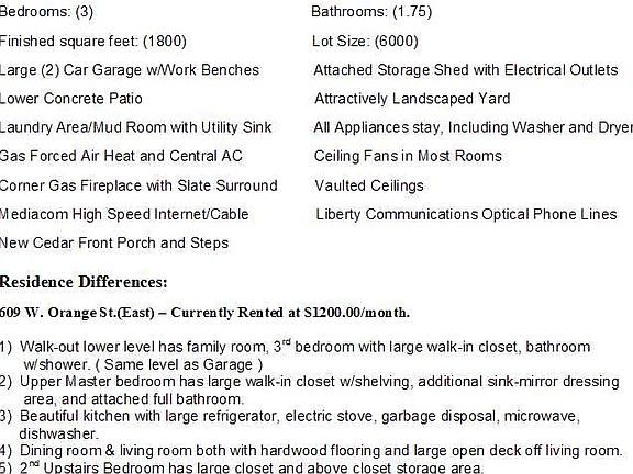 Excellent Investment Properties. Own one, rent other, and payment may be under $900.00/month, including taxes and insurance. Complete (2) Multifamily Duplex ( Zero-Lot-Line)For Sale - $344,800.00. These are "Zero-Lot-Line" Homes. We own both properties. One is rented out on lease for $1200.00/month and has been rented since its purchase in 2011. Both Properties include - Home Warranty Protection Plan. Excellent location for these 3 bedroom, 2 bathroom 0-Lots in West Branch close to schools, walking trails & downtown. Located in the Petersen Subdivision on the West side of West Branch, Iowa. Only minutes from Iowa City.WHAT I LOVE ABOUT THE HOME____________________________________________________________________Each Residence has the following:Year built: 2005 - Home Type: Duplex-Zero-Lot-LineBedrooms: (3) - Bathrooms: (1.75)Finished square feet: 1912 ( 1,176-Upper & 736-Lower ) - Lot Size: ( 6000 )Large (2) Car Garage w/Work Benches - Attached Storage Shed with Electrical OutletsLower Concrete Patio - Attractively Landscaped YardLaundry Area/Mud Room with Utility Sink - All Appliances stay, Including Washer and DryerGas Forced Air Heat and Central AC - Ceiling Fans in Most RoomsCorner Gas Fireplace - Vaulted CeilingsMediacom High Speed Internet/Cable - Liberty Communications Optical Phone LinesNew Cedar Front Porch and Steps (2014)____________________________________________________________________Residence Differences:611 W. Orange St., West Unit -- Current Owners ResidenceListed for $174,900.001) Walk-out lower level is part of a Mother-in-Law or Student Suite with large walk-in closet,attached bathroom (large shower), kitchenette (includes small refrigerator, sink, Microwave,Cabinets), and living room. ( Same level as Garage )2) Upper Master Bedroom has large walk-in closet w/shelving, additional sink-mirror dressingarea, and attached full bathroom with turbo tub.3) Beautiful kitchen with solid hardwood flooring with large refrigerator, electric stove,garbage disposal, microwave, dishwasher.4) Carpeted living room-dining room with large covered deck off living room. 5) 2nd Upstairs Bedroom currently serves as an Office with (2) desk areas, plentiful Solid WoodCabinetry, Large Closet with book shelving and above closet storage area.We will convert this back to a bedroom, if the buyer wishes.6) Extended Lower Patio with Fire Pit and Seating.____________________________________________________________________609 W. Orange St., East Unit -- Currently Rented at $1200.00/month.Listed for $169,900.001) Walk-out lower level has family room, 3rd bedroom with large walk-in closet, bathroomw/large shower. ( Same level as Garage )2) Upper Master bedroom has large walk-in closet w/shelving, additional sink-mirror dressingarea, and attached full bathroom.3) Beautiful kitchen with large refrigerator, electric stove, garbage disposal, microwave,dishwasher.4) Dining room & living room both with solid hardwood flooring and large open deck offliving room.5) 2nd Upstairs Bedroom has large closet and above closet storage area.Serious Buyer Only Please. Shown by appointment only. Thanks you for looking. 04/16/15