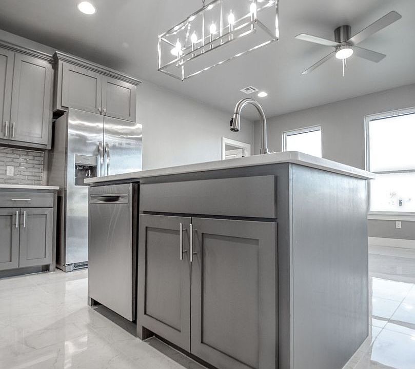 At the heart of the home is a well-appointed kitchen that will delight any cook. Outfitted with stainless steel appliances, elegant gray cabinetry, a stylish subway tile backsplash, and a central island with a built-in sink and garbage disposal, it's perfect for meal prep, casual dining, or entertaining friends and family.
