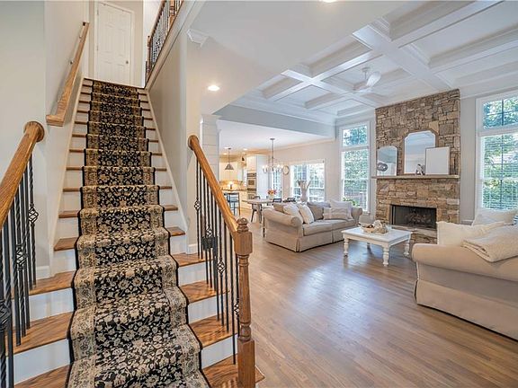 Curated Craftsman Style Perfection in River Green! This stunning 5-bedroom, 4-bath home with a 3-car garage and rocking chair front porch offers timeless elegance with a coastal chic interior, perfectly updated for modern living in one of the area’s most sought-after communities. From the moment you enter the grand foyer—with its detailed millwork, cathedral ceiling, sweeping staircase, and real hardwood floors throughout the main level—you’ll feel the light, bright, and effortlessly stylish design. The open-concept family room makes a statement with its dramatic coffered ceiling, cozy fireplace, and abundant light! The Family room flows seamlessly into an updated kitchen featuring designer lighting, granite counters, designer walk-in pantry, and ample cabinetry. A formal dining room and versatile living room/study with glass doors and transoms complete the perfect main-level layout for both everyday living and entertaining. A Bedroom with walk-in closet and full bath on main add convenience and flexibility for guests or multigenerational living. Upstairs, the oversized primary suite is a true retreat with a trey ceiling, private sitting area, and spa-inspired bath boasting a freestanding soaking tub, oversized glass shower, dual vanities, and a custom-designed walk-in closet. Secondary bedrooms include walk-in closets and ensuite or shared baths, while a spacious bonus room offers extra space for play, media, or office needs. Step outside to your private backyard haven—Outdoor Living space includes a deck, professionally designed hardscape, and fire pit ideal for gatherings.Level backyard offers ample space for a future dipping pool, playset, or trampoline — the perfect setting for outdoor fun and relaxation. The full unfinished basement includes a workshop and fitness center, offering endless possibilities for expansion. With updated lighting and fixtures throughout, this home is move-in ready, polished to perfection, and styled with an elegant coastal flair. All of this sitting on a premium culdesac lot in prestigious River Green, one of Cherokee County’s most desirable communities, offering a second pool at the Summer Club, six lighted tennis courts, soccer and playfields, children’s playgrounds, more than 200 acres of green space, and miles of trails leading to the beautiful Etowah River. Enjoy close proximity to vibrant Downtown Canton, lively Downtown Woodstock, Northside Cherokee Hospital, the Canton YMCA, scenic parks, top restaurants, shopping, and great schools. Additional highlights include a freshly painted exterior, newer roof, HVAC, brand-new hot water heater, and new carpet in select rooms. Cherokee homeowners age 62+ who have lived in the county with a homestead exemption for 5+ years also benefit from Cherokee County’s School Tax Exemption.