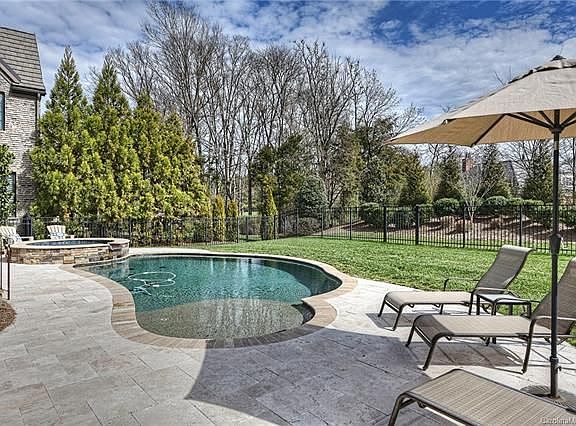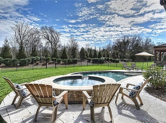Luxury home nestled in the cottages at exclusive, gated Longview Country Club with yard maintenance included. Signature Jack Nicklaus golf course community with world class amenities. Great South Charlotte location convenient to local shopping, dining and entertainment. This open concept floor plan with main floor master suite features rare private fenced backyard w/ gorgeous covered porch w/fireplace, travertine patio, pebble tec swimming pool, 8 person spa, built in stone kitchen with Lion Gas grill and refrigerator. Gourmet kitchen with custom soft-close cabinets, large center island and Thermador appliances. See through stone fireplace connects indoor and outdoor spaces featuring vaulted ceiling. A tile roof, plantation shutters, gleaming hardwood floors and beautiful trim work are just a few of the upgrades and unique touches that make this home special. Upper level features a cozy bonus room, 3 en-suite bedrooms, a computer niche and lots of walk-in storage.
