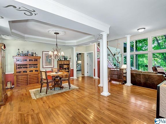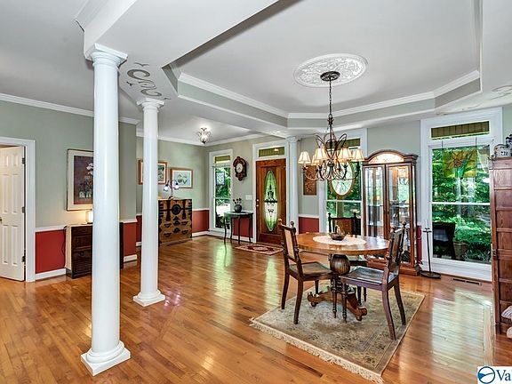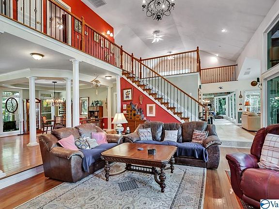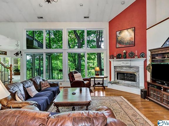 Snap up this rare chance to own a lovely basement home and horse pasture on 5 acres with fabulous Flint River views and access! Perfect for entertaining due to the spacious open kitchen, bar seating and main deck gazebo. Enjoy nature on 3 decks, in the hot tub, launch kayaks or canoes, fish, or relax in fenced 18X36 pool with covered porch, pergola, and building. Keep 2-3 horses in your own barn/shop with an upper loft. Feel at home in the elegant vaulted living and family rooms with gorgeous sunset, River views and so much more. Separate main level master opens to a balcony! Surrounding magnificent shade trees keep utility costs low. Only 25 minutes to HSV.