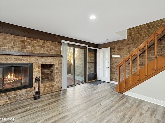 Beautiful updated 2 bedroom 1 bath two story townhome in Kennington Square located in the back of the 600 building with views of wooded nature space. No neighbors in your view from any windows or from your private outdoor court yard. Two story condo with brick accent walls, wood burning fireplace, eating area in kitchen, in unit stacked washer/dryer, two second floor bedrooms each with private balcony. Amazing large unit that is move in ready. Hip urban feel but in the burbs! Appliances and mechanicals less than 7 years old. Designated owner parking space #59 plus placard for additional non-designated space. NOTE: Can not close until January 2, 2023. No pet weight limitations but breed limitation. Check with HOA.