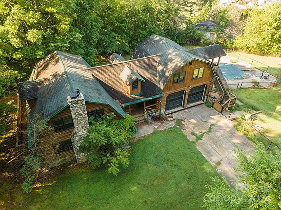 Enter this once stunning log home offering solid layout/design; an opportunity to create a serene estate perched on a hilltop. To a creative visionary with investment savvy, transform a promise into a magnificent retreat. Picture lounging by the pool, mt views, & peace with privacy. Sturdy logs/beams lay the perfect foundation for quick & easy upgrades. The warmth of exposed logs wraps you in a cozy embrace, while outside, your covered balcony off the primary suite invites you to savor long-range views of Asheville's majestic mountains. Evening falls, watch as the pool below lights up, framed by nightlife of the surrounding country. Nothing quite like the feeling of log homes, they speak of comfort, security, the essence of HOME.