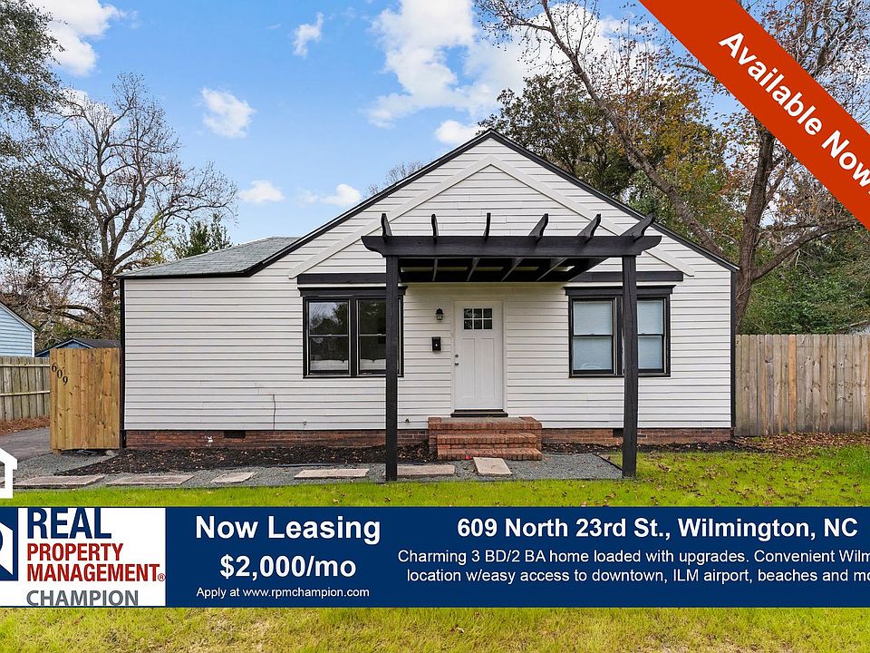 This charming 3 BD/2 BA home is loaded with updates and is cute as a button! LVP flooring flows throughout the living areas and bedrooms while beautiful tile is featured in the baths. The living room has a decorative fireplace and sunny windows. A flex room, adjoining the living room, is an ideal office or 3rd bedroom. The spacious kitchen includes ample storage and counter space, tile back splash, farm style double sink, stainless-steel appliances and a breakfast nook. The dining room has access to the laundry closet, complete with washer and dryer, and access to the deck and back yard. The primary bedroom has a private full bath that is a dream with its double sink vanity, step-in tile shower, separate water closet and walk-in closet. The guest bedroom is a comfortable space to relax and is convenient to the hall bath with a tub/shower combo. Convenient Wilmington location with easy access to downtown, ILM airport, colleges and a short drive to area beaches. Students and co-signers welcome. Hurry, this adorable home won't last long! We are an Equal Housing Opportunity Management Company and abide by the term of the Federal Fair Housing Act. No Cats. Up to 2 dogs at 60 lbs each allowed with prior approval. Aggressive breed list may apply. Contact listing agent prior to submitting application. No Smoking, e-cigarettes or vaping. All applicants over 18 years of age are subject to a background check, including criminal, credit, employment verification, and past tenancy.