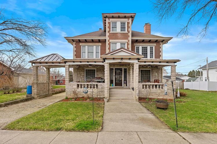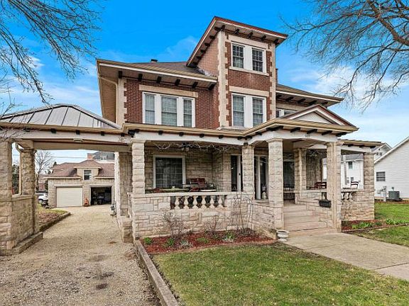 Gorgeous brick turn of the century home ready for you to move in... Enjoy a relaxing morning on the sprawling front porch. Walk through the front entry into the huge living room with hardwood floors, original oak columns, and fireplace, perfect for entertaining. There is room to seat everyone in the formal dining room for Thanksgiving! The updated kitchen has a breakfast nook and appliances stay. There is also a full bath and bedroom on the main floor. Take the oak staircase up to the second story to the open family room surrounded by 4 bedrooms and a full bathroom. Master bedroom has a large walk-in closet. Bedroom #2 has a balcony that overlooks the backyard. On the 3rd floor are bedrooms 6 and 7, and a nice office craft room playroom... in the basement there is a rec room with pool table, a dry bar with wood burning fireplace, work room, exercise room, laundry and plenty of storage! The 2 car garage has an attached carport covered patio, and above the garage at one point is another living area that they use for storage. Pride of ownership shows. Owners have had both chimneys rebuilt, and the whole house tuckpointed. Porch roof new in 2018, porch foundation lifted and rebuilt. Main roof new 2008, Most of the windows replaced around 2008. Newer gutters. 7 bedrooms, 2 full baths, (also a working toilet in basement) hardwood floors, beautiful front entry with original tile, original woodwork, 2 fireplaces (one coal burning, one wood burning), newer windows, double staircase with window seat. The 3rd floor has electric heat that the owners never used. Home is being sold as-is. Set up your private viewing today!