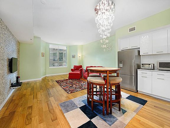 Spacious, bright 2 bedroom, 2 bath unit with wonderful open floor-great for entertaining-features a handsome beveled stone wall in the living room, blown bubble glass chandelier, sleek, chick kitchen cabinetry,Carrera countertops-KitchenAid SS appliances, gleaming hardwood floors, designer baths with Zumi tub or European shower, in unit laundry room and copious walk-in closet. Parking, community room, private exercise room and virtual doorman make this a stand-out home!