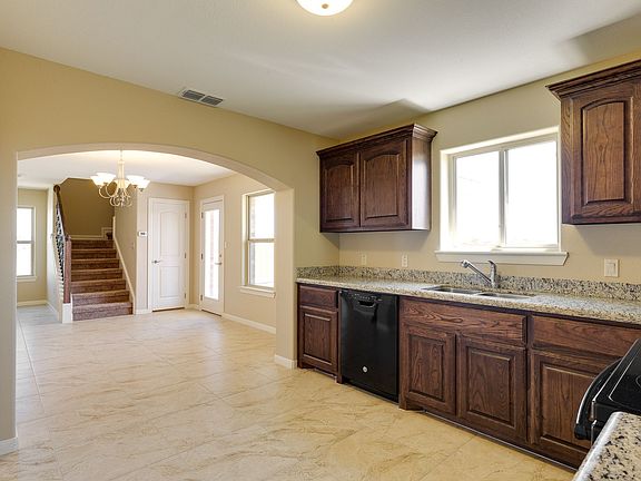 This 2 Story Sonora brick house is dressed with stone accents and has a beautiful arched plank door.. The home has 3 bedrooms all of which are upstairs, providing spacious living areas on the first floor and upgraded carpet areas to a beautiful Brennes Hueso tile. The second floor has a large living area that can serve as TV room, carpet throughout the second story. This Augustin includes brushed nickel hardware, black appliances, ash stained wood cabinets, and gorgeous Santa Cecelia granite countertops. Total living 1662 sq. ft.