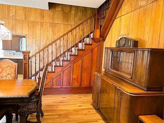 A historic 1885 home that holds original character. Walk into a formal dining with beautiful woodwork staircase. Living room is large & continues on with detailed woodwork. The galley style kitchen is eat-in, breakfast nook & all appliances will stay. Also on the main level is a master bed with 2 closet spaces, a full bath with tiled shower, oversized laundry/mudroom & office. A beautiful wood laminate runs through the main level. Upstairs is a 1/2 bath & 3 more beds, one features a walk out balcony.