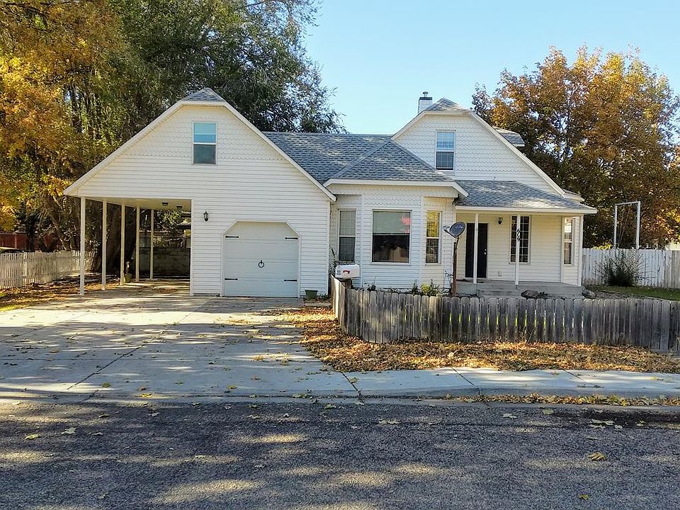 Classic home in central Blackfoot. Newer concrete driveway, sidewalk and front porch. Enter open floor plan home with hardwood floors in parlor/dining rm., with bay windows. Living room is large with parque style wood floor and large windows. Stairway leads to second level with two bedrooms. One is master with private bathroom and two closet areas. Carpeted family rm. has pocket doors. Up the wide stairway to large bedroom on one side and small room on the other, great for office, crafts or toy room. The main bath has new flooring, some plumbing, stand alone style tub and pedestal style sink. Enter the kitchen with appliances included and bar style counter. Large walk in pantry for storage. Laundry is close to back door and bsmt access. Bsmt is very clean has gas water heater & furnace. Small privacy fenced back yard area, a fire pit area, plenty of room for off road parking in single garage & large, tall tandem car port. Lots of living space in this corner lot home. Some newer siding, windows & paint. Sold As Is. Listing held so repairs could be done.