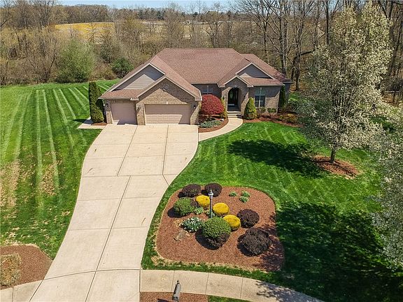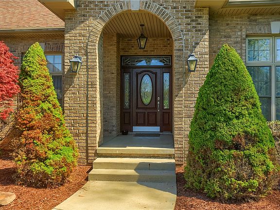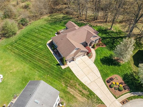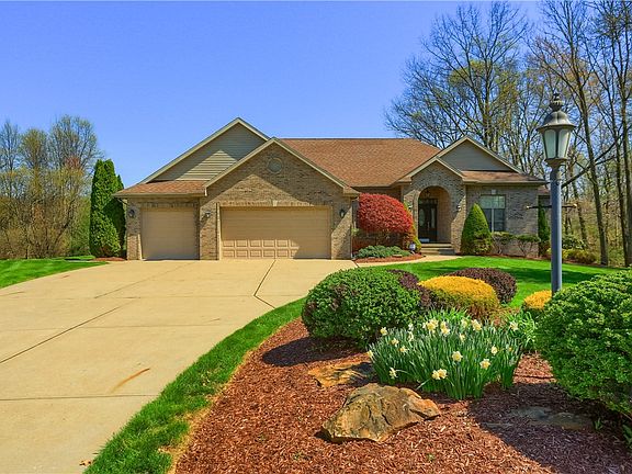 Tucked at the end of a scenic cul-de-sac in a sought-after community with a pool, clubhouse, and gym, this stunning custom built ranch blends elegance and comfort. A grand entry welcomes you with 10-ft ceilings, hardwood floors, and crown molding. French doors open to a private office with built-ins, while the dining room impresses with trey ceilings and chair rail. The expansive family room flows to a vaulted sunroom and connects seamlessly to the chef’s kitchen featuring custom cabinets, stainless appliances, double wall ovens, and recessed lighting. The primary suite offers crown molding, a 15x5 walk-in closet, and a spa bath with dual sinks, soaker tub, and skylight. Two bright guest rooms share a hall bath. A powder room and laundry add convenience. The walk-out lower level is ready for your vision, with plumbing for a future bath. Outside, enjoy a large deck, flat yard, mature trees, and a 3-car garage with utility sink and man door. A perfect blend of design and lifestyle.