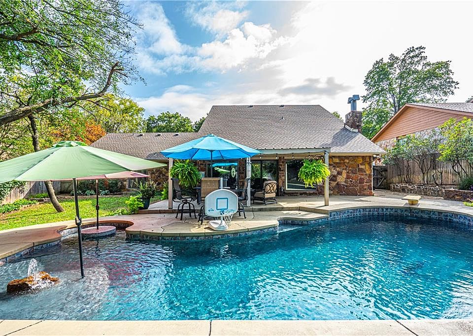 WOW! Rare find in the "Heart of Edmond." This property offers 4 beds/3 full baths/ 2 family areas/2 dining areas. Large windows provide a STUNNING view of OASIS outdoor area. The FABULOUS concrete pool includes BUILT-IN SEATING and SHADE AREAS. Warm HICKORY wood floors welcome you into this OPEN FLOOR PLAN home w/stone fire place. This space is perfect for entertaining! Kitchen has been updated with granite counter tops/tile back splash/stainless appliances. Remodeled master bath and guest bath! Master bedroom host extra large custom designed closet. UPDATES also include windows, interior and exterior doors. Carpet replace downstairs and upper floor. OUTDOOR sitting area extended to seat lots of guest. Roof replaced in 2015!