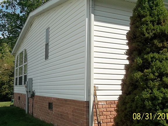 Manufactured 32x50 3 bedrooms, 2 full baths, Living room with fireplace (gas logs), Dining room, Kitchen (with d.w., microwave, range, refrigerator, washer/dryer), Breakfast area with lots of windows, Hardwoods in LR,DR, Master bedroom. Vinyl in Kitchen and baths. Master bath has tub & shower plus double vanities. Covered back porch. 2 storage bldgs. Garden space. Creek in back but flood insurance is not required. Very open floor plan-different ceiling for heights