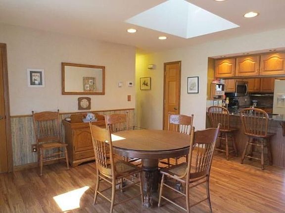 Spacious light-filled rooms, this move-in-ready ranch is perfect! Gorgeous updated KTN w/quartz countertop, SS range, sink & microwave & convenient breakfast bar. Living Rm has lg bow window, built-in display cabinet & trendy colors. Skylights enhance dining rm & full bath. You'll appreciate the main level laundry & HW or laminate floors throughout. Especially enjoyable is the lg deck off DR, beautiful landscape & gardens w/many perennials, water fountain & house-shed. Lovingly cared for + Home Warranty!