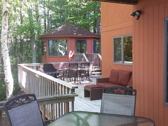 4 Bedroom, 4 bathroom, 3600 Sq Ft Door County home in Sturgeon Bay. This home is located on a bluff, with 5 acres, over looking The Sturgeon and Green Bay's. It has a 3 seasons, Heated Gazebo. Two Laundry rooms (Main floor Laundry and 2nd Floor Laundry), a Formal Dining room, Eat in Kitchen - with access to the main floor outside deck. A walk out finished basement, that also showcases a partially Cedar lined Wine Cellar. There is an oversized 2 car attached garage, that is set up with a Dayton Transfer switch for connecting to back up power. Stone and Cedar siding, Vaulted ceilings, plenty of windows to bring in the natural light, 3 4 inch thick Hickory wood floors on the main level, ceramic tile flooring in most of the bathrooms and upstairs Laundry Room.