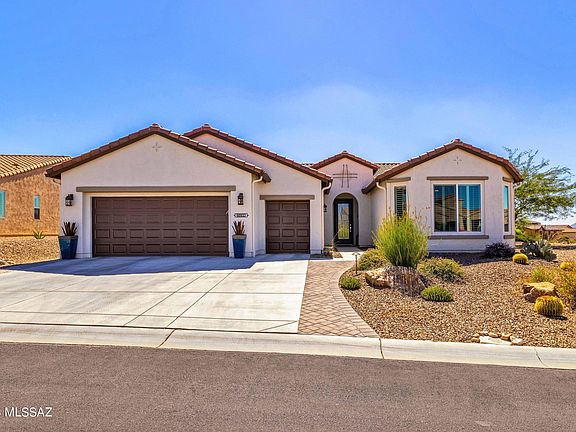Centrally located in the heart of SaddleBrooke Ranch, and within walking distance to all the amenities the ranch has to offer. This spectacular Cortez model on a spacious corner lot is a dream come true. Chef's kitchen offers a generous island, upgraded quartz countertops, designer backsplash and upgraded Stainless Steel appliances. The tranquil primary suite is spacious and boasts double vanity sinks, spa like walk-in shower and a walk-in closet. Split floorplan features an inviting guest bedroom with an en-suite bath for your guest's privacy. Multi-Purpose den can be a TV room, a craft room, or an office if desired. The expanded 2 car garage with optional golf cart garage has an abundance of storage and plenty of room for your cars, golf carts and other toys. The covered patio includes custom roller shades and leads to the inviting backyard with built-in barbeque. This home has everything you would ever want to live the best desert lifestyle. Don't wait to live the dream.