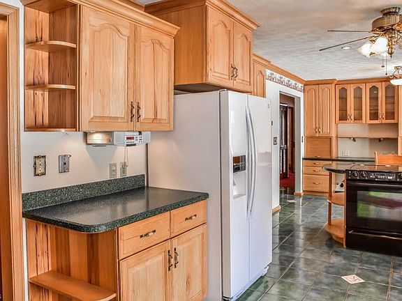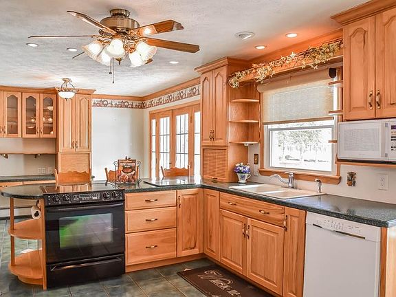 Beautiful 3 bedroom, 3 full bath ranch on 4.4 acres in a gorgeous, private country setting! Pushed far off the road with cleared, flat acreage in the backyard providing picturesque views! Inside, this home offers expansive living areas with large windows to let the sunshine in. The 19x12 living room features brand new carpet while the family room boasts a lovely brick fireplace. Crack open your cookbook in the fully applianced eat-in kitchen with updated hickory cabinets, solid surface countertops, a breakfast bar, built-in hutch, a dinette, pantry and French doors to the back deck. Down the hall, there are 3 bedrooms and a remodeled full bath with tile flooring and shower surround. The master suite has an updated private full bath. The finished, walkout lower level has been waterproofed with a lifetime transferable warranty. Finished areas include a rec room with a wood burning stove, bonus room with foam tile flooring and a possible fourth bedroom with a private full bath. Enjoy acreage views from the sunroom or from the tiered deck! Heated 2-car side load garage with shelving for storage PLUS a 28x26 garage/barn with electric and cement floor. Nicely landscaped yard with a covered front porch gives this home wonderful curb appeal! Move-in ready - donât miss out!
