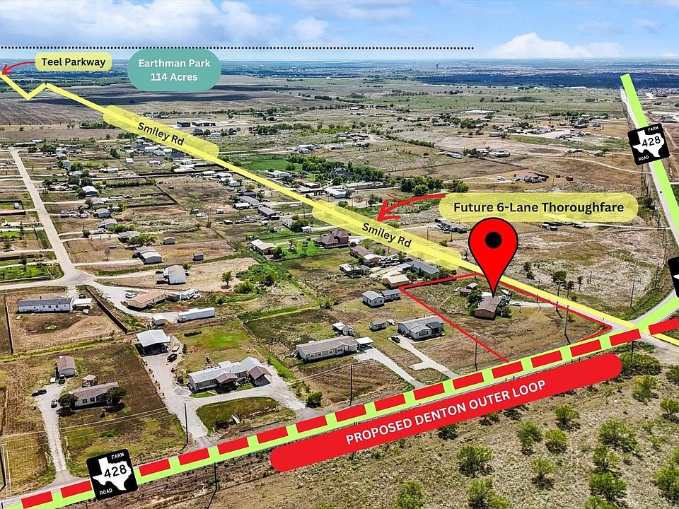 **PRIME INVESTMENT OPPORTUNITY @ AN INCREDIBLE PRICE!** Located on a prominent corner near the future Outer Loop and with potential commercial zoning, this property combines the tranquility of country living for now with promising future convenience and profitability. With approximately 180’ and 273’ of road frontage, it’s perfectly positioned at one of the identified interchanges of the future Denton Outer Loop road, minutes from Dallas North Tollway, major cities including Prosper, Frisco, Aubrey and others, hospitals, fire departments, a mile from the upcoming Earthman Park—an exciting 114-acre recreational area in Celina featuring sports fields, a dog park, ponds, trails, and an amphitheater. Seize this chance to own versatile land in Celina’s ETJ, offering limitless future potential and no HOA, providing you with the freedom to maximize its use. Smiley Road, also known as Teel Parkway, provides easy access to Prosper and is projected to become a major route along the future Denton Outer Loop. This is your opportunity to invest in Celina’s thriving growth! The home on the property needs a little TLC but you can potentially rent it out until you are ready to move forward with converting this into a commercial site. Low taxes as its current use.