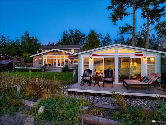 Once-in-a-lifetime opportunity for a waters’ edge compound in the San Juan Islands. The most desired, sandy, 100 feet of walk-out waterfront on Guemes Island’s West Beach. Walls of windows frame islands, water & sunset views from almost every room. Exquisite finishes, light fixtures & flooring with echoes of the sea. Chef’s kitchen, walnut & quartz countertops, Jenn-Air appliances, walk-in pantry. Great room has live-edge walnut bar w/light fixture in a 1926 dinghy. Main floor primary, luxury ensuite bath, walk-in closet. Upstairs view guest suite. Private, grandfathered-in boat house on the beach with ¾ bath, deck, a great extra space for guests! New 1850sqft shop & garden. 1.67acres. Stout mooring buoy,56ft-er. Explore islands!