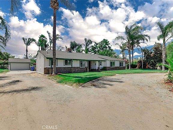This absolute beautiful 4 bedroom, 2 bath home ranch style sits on approximately .69 acres of horse property and is a rare find. The property has a lot to offer. A spacious living room with rock surround fireplace, crown molding and recessed lighting. Dinning room with brick surround fireplace and recessed lighting. Kitchen with granite counter tops and a breakfast bar, recessed lighting, eating area, walk-in pantry, 4 burners stove, with grill and griddle and 2 ovens. Two full bathrooms, and four spacious bedrooms, including main suite. Linen closet and plantation shutters, spacious enclosed patio, backyard open concrete patio, fish pond, 2 car detached garage, horse area, tac room, permaculture style secret garden with a potting shed. Lots of fruit trees( oranges, lemons, lime, grape fruit, pomegranate, and papaya). Fully fenced yard with chain link fencing and a front gate. Close to riding trails. Lots of room for horses, pool, RV parking and much much more. Septic, roof and electrical has been upgraded in the last few years. Centrally located, close to schools, shops, entertainment, golf courses, restaurants and freeways (91, 15 and 60)