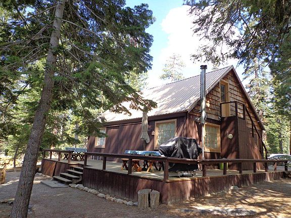 Step into this warm and welcoming sunny Huntington Lake cabin surrounded by tall pines! Loaded with character, this spotless cabin is a relaxing get-away in the cool fresh mountain air. Two bedrooms and a remodeled bathroom with a fiberglass shower on the main level for great functionality plus a nice large dormer with storage closet and added large window upstairs add plenty of sleeping space for family and guests. Desirable open wall between the kitchen and living room. Sliding glass door in the living room with a barn door storm exterior door. Plastered ceilings in the living room, both downstairs bedrooms, bathroom and bathroom walls. Newer metal roof replaced the corrugated aluminum roof. Rebuilt and enlarged exterior deck and stairs. Cement foundation on the north side of the cabin and cement piers on the south side of the cabin. A storage unit under the exterior staircase has room for a washer and dryer. Boat slip included! Located on USFS land. Cash only.