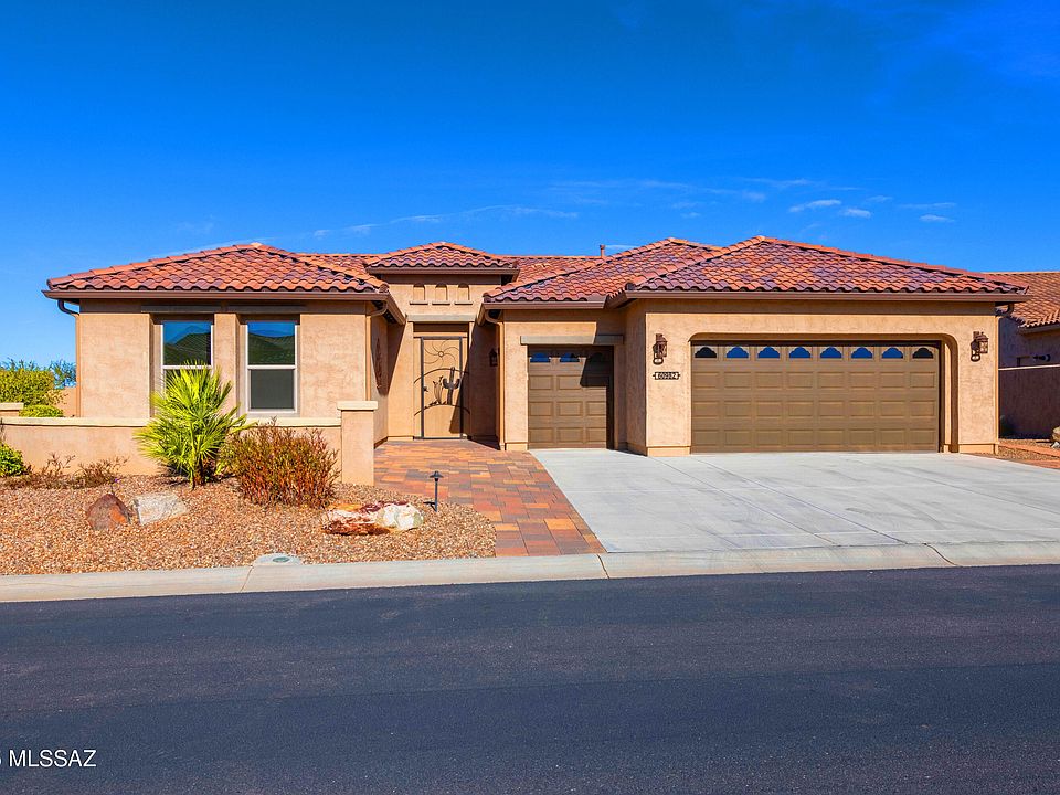 Welcome home to this Cortez home on an over-sized lot in the highly sought-after community of SaddleBrooke Ranch. From the front courtyard area, enjoy views of Mt. Lemmon. This home boasts new LVP Flooring throughout most of the home and newer carpet in the remainder. The generous great room opens to the beautiful kitchen with Quartz countertops and new refrigerator and gas cooktop. This 2 bedrooms; 2 1/2 bathroom home offers a split-bedroom floor plan for the ultimate in privacy for you and your guests. The primary bath features a large walk-in shower and a soaking tub. The guest suite features a full bath. The extended 2 1/2 car garage has plenty of space for two cars, your golf cart(s) and hobbies. This immense lot has room to create an absolute dream back yard. Consider a pool, gazebo, turf areas...The sky's the limit. At this price point, you will not find a home like this. It may take a bit of vision to see what this could be, so bring your imagination. This one won't last.