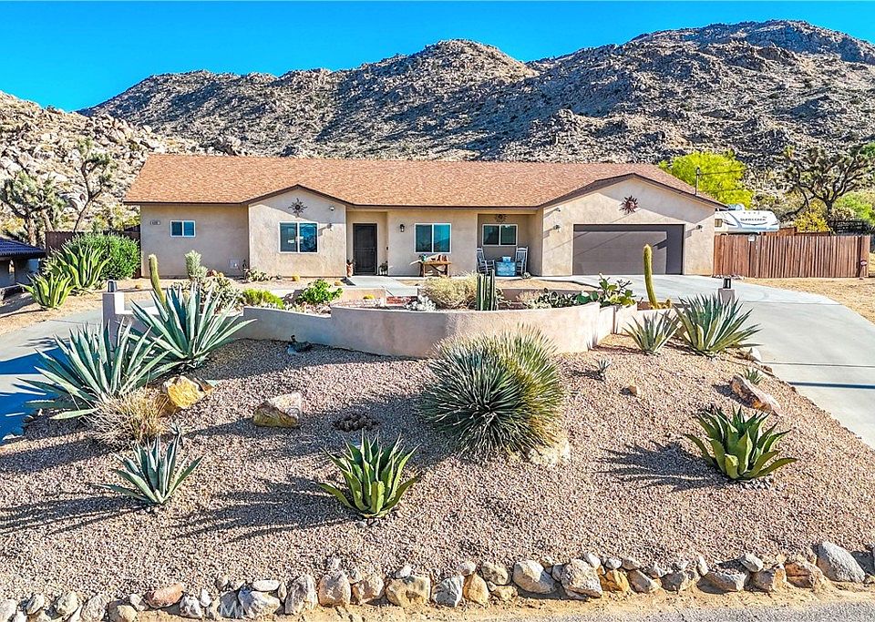 JUST REDUCED! This exquisite oasis perfectly situated with 684 acres of protected land, hiking trails, boulders, mountain views, and the iconic Joshua Trees right out the back gate, whether you're an outdoor enthusiast or simply seeking tranquility, this property offers everything you need and more. This custom built home features a spacious primary bedroom and a guest suite plus 2 spare bedrooms with a large shared bathroom with modern fixtures and desert-inspired design. Come explore the great outdoors this backyard is a must see with its western inspired features and a hot tub for those cold winter nights and refreshing 4' deep cowboy tank with a deck for cooling off on hot summer days, plus a fire pit for stargazing and marshmallow roasting, and that's not all, lets have a family barbecue, featuring a custom built barbecue shack for cooking up some food for friends & family. The landscaping has an array of cacti, plants, and mature trees, creating a private and serene environment. This property also has a full RV hookup with a 30 amp outlet. Just 2 minutes to Joshua Tree Village with eclectic shops & delicious restaurants, and only 5 minutes to the Joshua Tree National Park entrance. Don't miss the opportunity to own a piece of paradise in one of California's most iconic destinations. Schedule a viewing today and make this incredible desert haven your own!