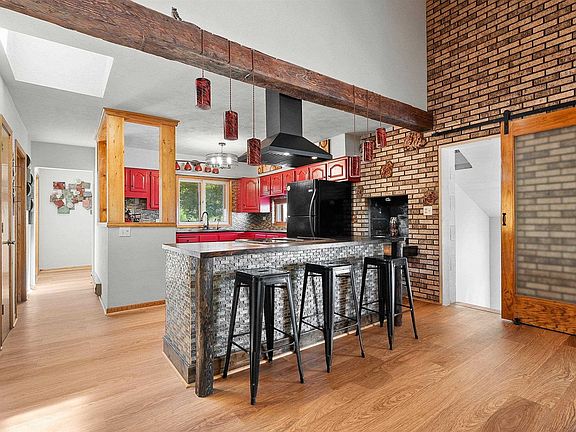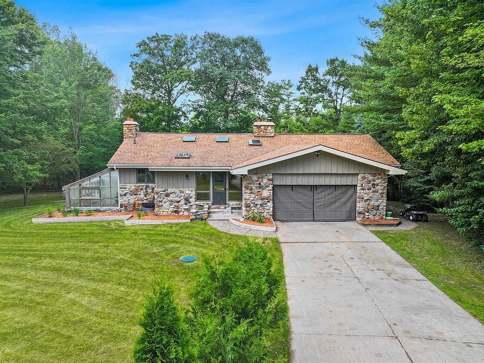 This exquisite residence is a meticulously designed dwelling located along the picturesque riverfront. It boasts a unique architectural style, combining the timeless charm of cedar and stone siding with the modern touch of cinder block construction and sleek metal frames and doors. The interior is a haven of elegance, featuring soaring vaulted ceilings, rich oak walls, and exquisite glass mosaic tiling that adds a touch of artistry to the space. The property offers an array of luxurious amenities, including a newly added lower level Jacuzzi suite that promises relaxation and rejuvenation. Step onto the expansive wrap-around deck, where you can bask in the tranquil vistas of the flowing river, or indulge in your green thumb with a personal greenhouse attached to the property.