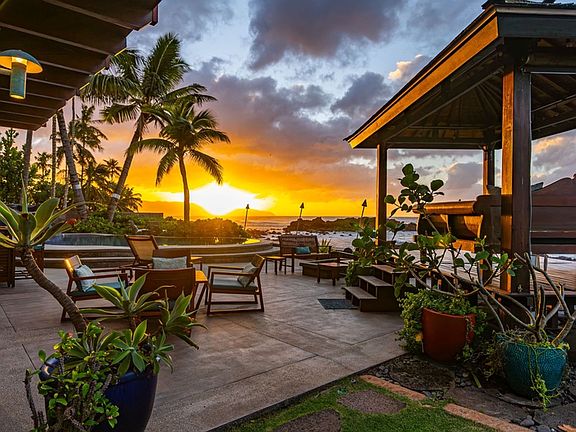 The property's outdoor areas are just as impressive as its interiors. The infinity pool, surrounded by lush tropical landscaping, is the perfect spot for soaking up the sun or watching the nearby surf breaks. Multiple patios and balconies equipped with tiki torches offer spaces for al fresco dining, lounging, or simply enjoying the breathtaking views.