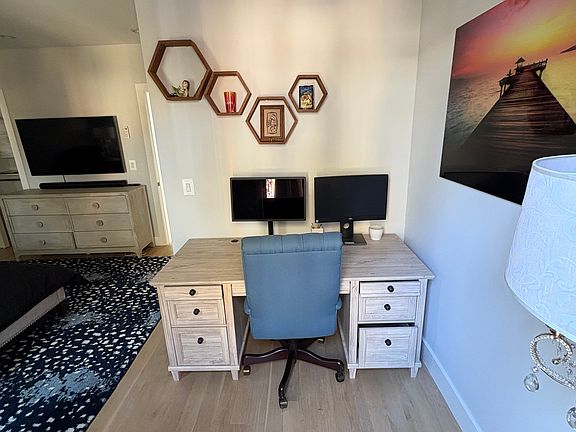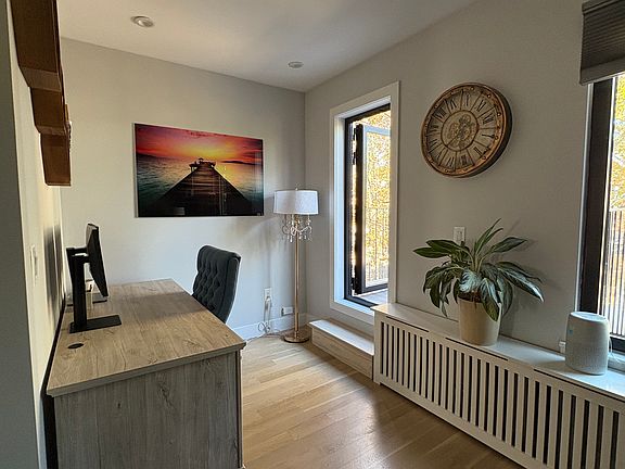 Small office spaceLots of natural lightBright and airyStainless steel appliancesModern cozy welcoming vibeCute balconyOpen kitchen