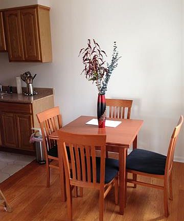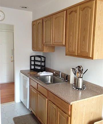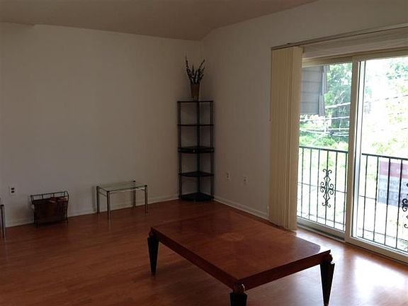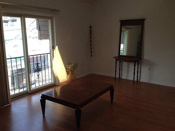 1 bedroom, 1 bathroom condo on top floor of low-rise building, with mod kitchen and bath, cathedral ceilings with skylight, French balcony, laminate floors, central air and heat. One deeded parking space in garage. Located 1/2 block from Blvd East for easy transportation to NYC and Ferry.