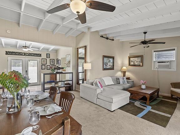 This classic Hawaiian home boasts a generous 2,750 square feet of living space on a sprawling 16,464-square-foot lot. The open living area features cozy seating and large windows, inviting natural light and stunning ocean views. The fully equipped kitchen offers everything you need to prepare meals, while the dining table comfortably seats six for shared gatherings.