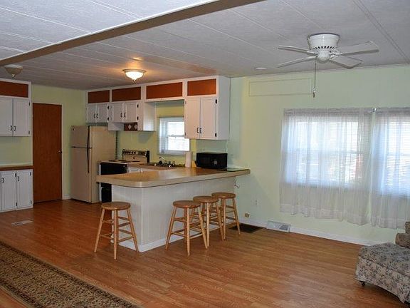 Nice lovely two bedroom, two bathroom open concept home. Home has a living space of 1200 square feet ! Laminate floors, Harvey windows, rubber roof, glassed in porch in rear and an open porch in front. Pristine lot with irrigation system and mature plantings. Newer vinyl sided storage shed. Bright and cheery and ready for your personal touch. You're Home !