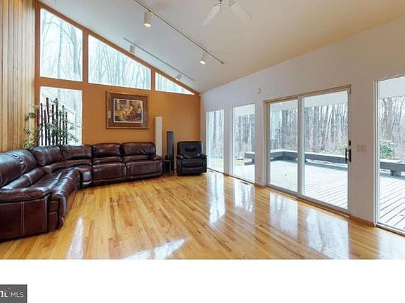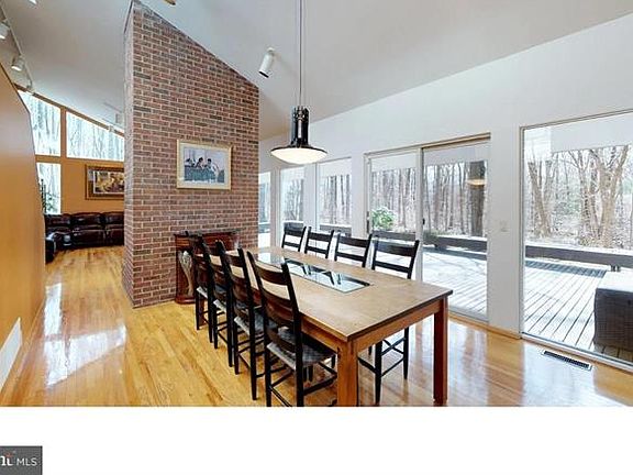 A light-filled Princeton Contemporary is cleverly configured to take advantage of a serene woodland setting with sliders spanning the entire width of the open concept living spaces. A long deck with built-in benches before a border of natural rocks easing into a stretch of majestic trees. The stone driveway leads to the garage and atrium foyer, where textured wood walls begin and run along a balcony walkway. A laundry room/office area with powder room is handy to the vaulted master wing with large tiled bath. Another full bath serves two more vaulted bedrooms. Below the high-end professionally equipped kitchen with expansive island is command central for the airy, open lounging and entertaining areas, all sporting hardwood floors. A breakfast/sitting room and dining room directly adjoin, while the living room is partially separated by a brick fireplace. Plenty of space for recreation exists in the finished lower level with full bath, kitchenette area, and three large separate rooms for an entertainment, office and exercise.
