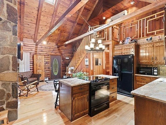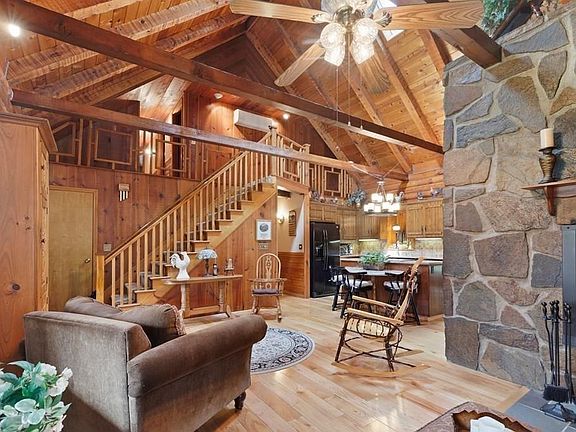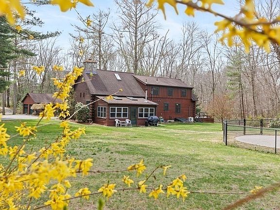 Welcome to this Nature Lovers Retreat! This winding driveway 1000ft off the road brings you over a small stream as you enter this nearly 5 acre property, offering a 10 room log cabin, 2 car oversized garage with additional work space area, tennis court, 3 stall barn offering electric/water, with paddocks/tack room, and a salt water lagoon shaped pool with cabana. Enjoy the privacy creating your own homestead! This home has been meticulously cared for and you will be able to just move in and enjoy the approaching summer months! Inside the log cabin you will find 3 levels of living-first floor-2 bedrooms, 2 full baths, open concept Kitchen with granite counters, center island, dining room, family room and living room all with soaring vaulted ceilings and exposed beams. 2nd floor with full bath and 2 bedrooms, lower level offers rec room, mini kitchen and 2 additional office/play rooms and laundry room. What an opportunity for everyone in this property-call today for a showing!