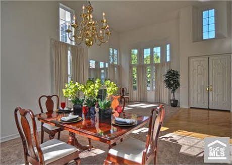 4 large bedrooms, mainfloor bedroom has ensuite full bath. Island kitchen (has lots of workspace), and nook are 100% open to family room with fireplace. Master suite with fireplace, walk in closet, large bath. Formal living room with 20' ceilings, fireplace, custom drapes. Grounds are manicured. Freshly painted, new carpet. Original owner pre paid the mello roos assessment years ago for the duration of the bond. Neighborhood Description Come home to the gated community at The Pointe... lots of windows bringing the outdoors in, interior very neutral and immaculate
