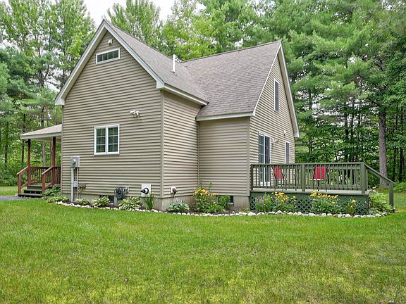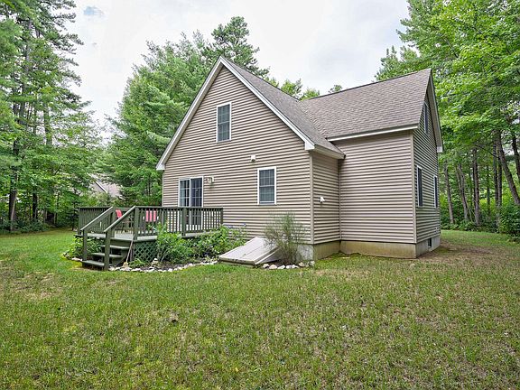 This well-built cape in Madison, NH, is nestled among the trees in a quiet community, yet close to local activities and attractions. As you approach, you're greeted by a large farmer's porch and a small lawn. The home is thoughtfully designed, with entry into a comfortable kitchen/dining area that connects to a cozy living room featuring a custom wood cathedral ceiling. A spacious first-floor primary suite offers a walk-in closet, a comfortable bathroom, and first-floor laundry. Upstairs, you'll find two bedrooms with their own full bathroom. The basement, currently unfinished, provides potential for additional living space, such as a workshop, movie room, or second living area. Out back is a private landscaped yard and a small deck off the kitchen.