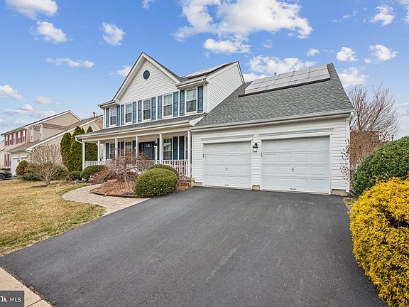 Solar panels are OWNED and PAID IN FULL! And they were installed in 2018! All the benefits of solar with NO monthly solar payment! SRECS too! Beautiful curb appeal and a sprawling front porch greet you as you pull up to this lovely home, situated in the desirable neighborhood of Steeplechase. This spacious four bedroom home features gleaming hardwood floors throughout most of the first floor, a large primary bedroom (with walk in closet and roomy private bathroom), and a fully finished basement. You'll love the backyard, including the impressive hardscaping, large shed, and vinyl fencing. This home also boasts a newer roof (2018), new furnace (2022), newer central air (2020), newer water heater (2022), newer appliances, new windows (front/bathrooms), newer exterior doors, new backyard fencing, and more!!! Close to shopping complexes, fitness centers, restaurants, medical offices, and major retailers, this home offers unparalleled convenience and a prime location for everyday living. More so, this neighborhood is minutes from Green Acres Park, Sylvan Lake, Rancocas Creek, and other local outdoor recreational spots great for jogging, biking, kayaking, or relaxing with pets.