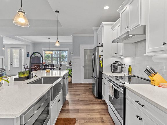 Beautiful kitchen with 42" cabinetry, under cabinet lighting, soft close drawers, stainless appliances, quartz counter tops, pantry, & large center island. Breakfast nook + a formal dining room that has a coffered ceiling. Living room with vaulted ceiling & gas fireplace. 1st floor primary bedroom w/ walk in tiled shower, 2 sinks, & walk-in closet. 2 more bedrooms on 1st floor & upstairs is 4th bedroom/bonus. Laundry room with washer & dryer hookups. Back screened porch. Large back patio with firepit. 2 car attached garage. Walk-in attic storage. Nestled on a cul-de-sac. Water access community with sidewalks, pool, clubhouse, dock, gazebo, kayak launch. Topsail school district. Basic lawn maintenance included. One year lease. Non-smoker's only (inside or outside). 1-2 pets possibly allowed with pet fee. Tenant responsible for all utilities.