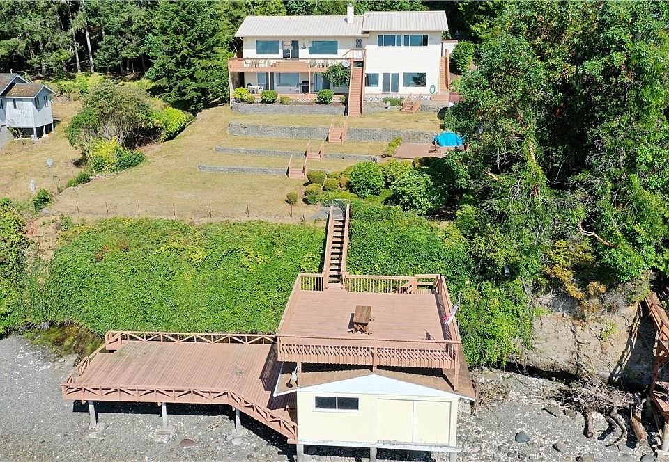 Magnificent & wide Hood Canal views to East for gorgeous sunrises! 2959 sq. ft. rambler with fully finished basement. All rooms are huge & have full views & access to decks on both levels. Upstairs is large kitchen, dining area & living room. Downstairs is massive Master w/private bath w/big walk-in closet, jetted tub and glass block walk-in shower. Also 2nd big bedroom & huge Rec Room with 2nd kitchen. Property has RV Parking, Tidelands, large deck over rare private boathouse & huge Pier!