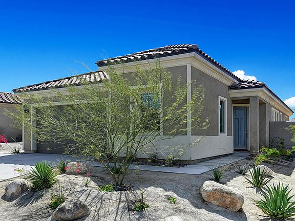 Welcome to Del Webb, the gated 55+ community in historic Rancho Mirage. This contemporary Getaway model was built in 2021 and offers 2 bedrooms, 2 bathrooms, an open floor plan with 10' ceilings throughout, a Chef's kitchen with quartz countertops and breakfast bar, laundry room and 2 car garage. The primary bedroom has a lovely ensuite bathroom with dual vanity, quartz countertops, large shower stall, and walk-in closet. The guest accommodations, separated from the primary suite, feature an adjacent full bath, offering comfort and privacy to your visitors. An oversized sliding door provides access to the expansive, partially covered rear patio, providing shaded comfort to extend outdoor living for dining, relaxing or entertaining. This home has owned solar and a tankless water heater. The Del Webb community features thoughtfully designed new homes and world-class amenities including a state-of-the-art fitness club, Tennis, Pickleball, bocce courts, covered and outdoor pools, putting greens, a clubhouse, outdoor lounge and more! With close proximity to excellent shopping, restaurants, golf and recreation, Del Webb Rancho Mirage is the finest in active adult communities. Don't miss this lovely home in an outstanding community, that is only 2 years old!