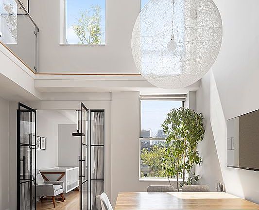 Upstairs, a large mezzanine level is currently used as an open primary suite, complete with its own home office space, a second full bathroom with stall shower, and direct access to a private rooftop terrace with open sky and downtown Manhattan views.