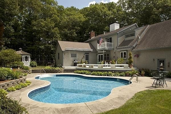 Golf View!! You don't have to be a golfer to enjoy the beautifully manicured green and fairway in your back yard. Heated pool, deck, patio and fountain add to the luxurious atmosphere. This inviting Custom Cape style home is located in an exceptionally private two acre retreat setting in a desirable neighborhood. Features a true gourmet kitchen with expansive counter, island, maple cabinetry, Viking gas range, wine refrigerator, copper bar sink and more! Comfortable open floor plan with wide plank pine flooring. Offers four bedrooms including main floor master suite with walk-in closet, custom built-ins, cathedral ceiling, walk-in tiled shower, and outside access to pool, deck and yard. Second floor large bedroom with full bath, gas stove, Juliette balcony/deck with great views of pool and golf. Newer furnace, new Tiger Shark robot pool cleaner, new whole house generator; whole house exterior painted in 2014. Convenient access to BOSTON Commuter train in Halifax or Hanson.