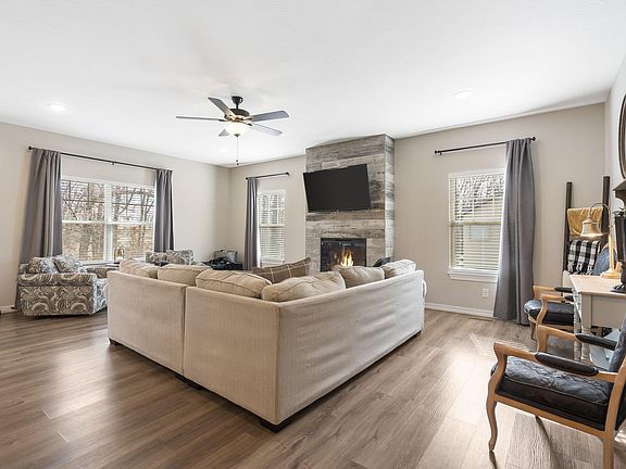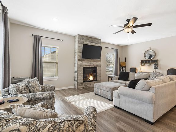 Incredible walk-out basement home in Three Pine Estates! This 2022 built home features 4 beds, 3 baths and is situated on a quiet cul-de-sac with no backyard neighbors, a storm shelter, John Deere room, and granite counters! The open floor plan living room offers abundant natural light, LVP flooring, and a gas fireplace. Kitchen features white cabinets, a center island with barstool seating, stainless appliances, and attached dining space. Off the kitchen is a laundry room w/ access to the 3 car garage, a bedroom with vaulted ceilings, and nearby full bathroom. The main floor primary suite features an attached bathroom with dual sink vanity, dual closets, walk-in shower, tub, and a private water closet. The walk-out basement offers a large 2nd living space, John Deere room, 2 carpeted bedrooms, one with a large walk-in closet/ storm shelter, and a full bathroom. Enjoy outside entertaining on the upper deck or lower covered patio. Fully fenced in yard with wooded privacy behind. Quick access to Hwy 13.