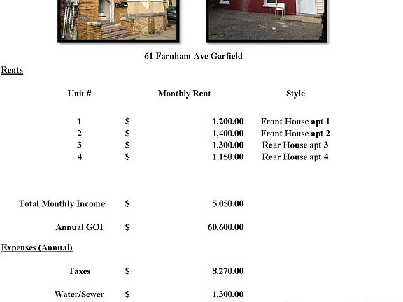 Fabulous investment opportunity! - 4 family in Garfield, updated apartments, all separate utilities and low taxes!!! Cap rate 8.8%, Excellent return on your money!!! Front house offers 2 apartments with 2BR, 1BA each and full unfinished basement. Central A/C and forced Hot Air. Rear House offers 2 apartment with 2BR,1BA each, tankless water heaters, hot water baseboard and window A/C. No basement in rear house. Street Parking only. Please see attached photo for income and expense.