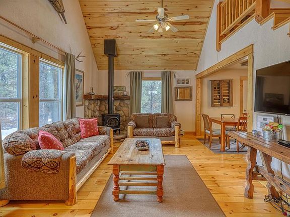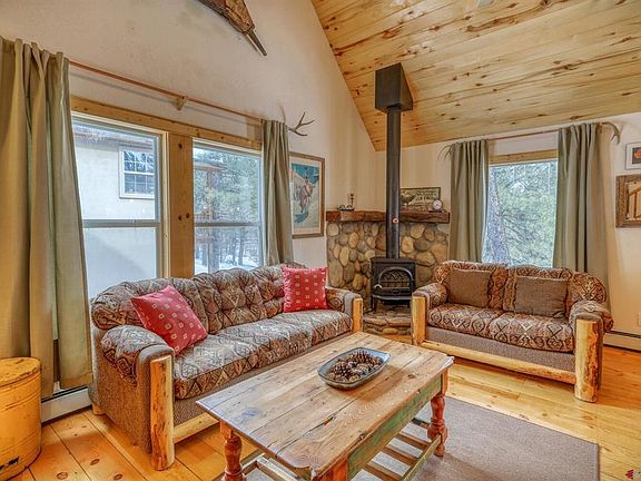 Cozy Cabin on a beautiful wooded lot. Vaulted T&G ceilings, wood floors, wood stove, spacious deck, walk-out basement, covered front porch, backs to large greenbelt for more elbow room, lots of light. The basement has been finished out with a bedroom, full bathroom, game area, and extra living area. This is a fantastic investment opportunity as all furniture, furnishings, hot, tub, kitchen items, linens, decorations, etc... are being included in the sale.