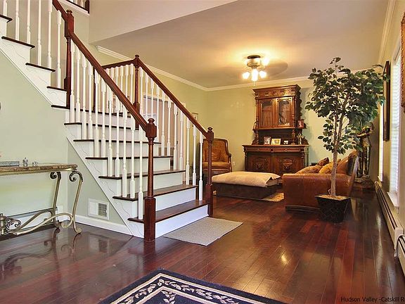 Big, beautiful and nicely landscaped modern colonial nestled in a quiet neighborhood between Village of Saugerties and Woodstock areas. Recently painted and updated, it boasts large rooms, high ceilings and crown molding throughout. An expansive, soaring front foyer, separate laundry room, hardwood floors and an open airy floor plan are some of the many features in this family ready home. The kitchen has a sizable pantry, plenty of prep space and bar side breakfast area space which flows out to an enjoyable elevated deck and private, fenced-in back yard. Take one of the staircases up to find 3 nice bedrooms, a full bath in the main hallway along with a master suite(4th bedroom) which includes a sizable walk in closet, a spacious bathroom with deep soaking tub, separate shower and plenty of dressing room. The finished lower level features newly installed electric heat or a wood burning stove, with plenty of play, workout or storage space. It also enjoys it's own separate entrance which takes you directly into the back yard and deck areas. This home has been well cared for and is move-in ready!!