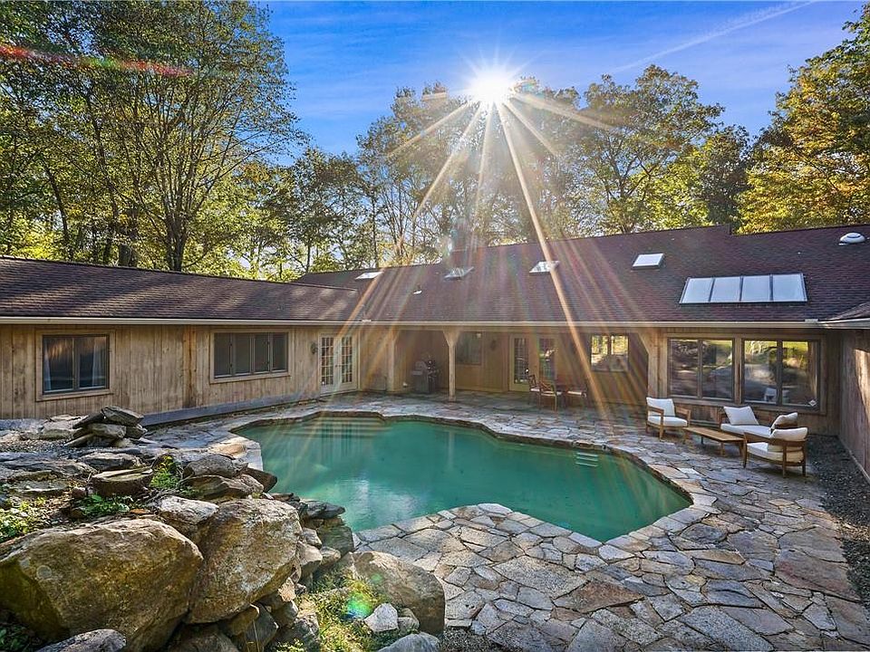 Stylish Retreat. Surrounded by park-like grounds in a peaceful and private setting. Long drive to spacious country house with a lodge-like interior. Vaulted ceilings, exposed beams and desirable open floorplan. Impressive Great Room with floor-to-ceiling stone fireplace, seating and dining areas and open-concept Kitchen. Skylit Family Room. Four Bedrooms include a private Primary Suite with fireplace and loft. Large Bonus Room with incredible possibilities as Home Office, Studio or Playroom. Beautifully landscaped two acres with privately sited Swimming Pool. Moment’s drive to the town park and the shops and restaurants of Scotts Corners. Easy access to the Merritt Parkway and Stamford. Unique! Additional Information: Amenities:Stall Shower,ParkingFeatures:2 Car Attached,
